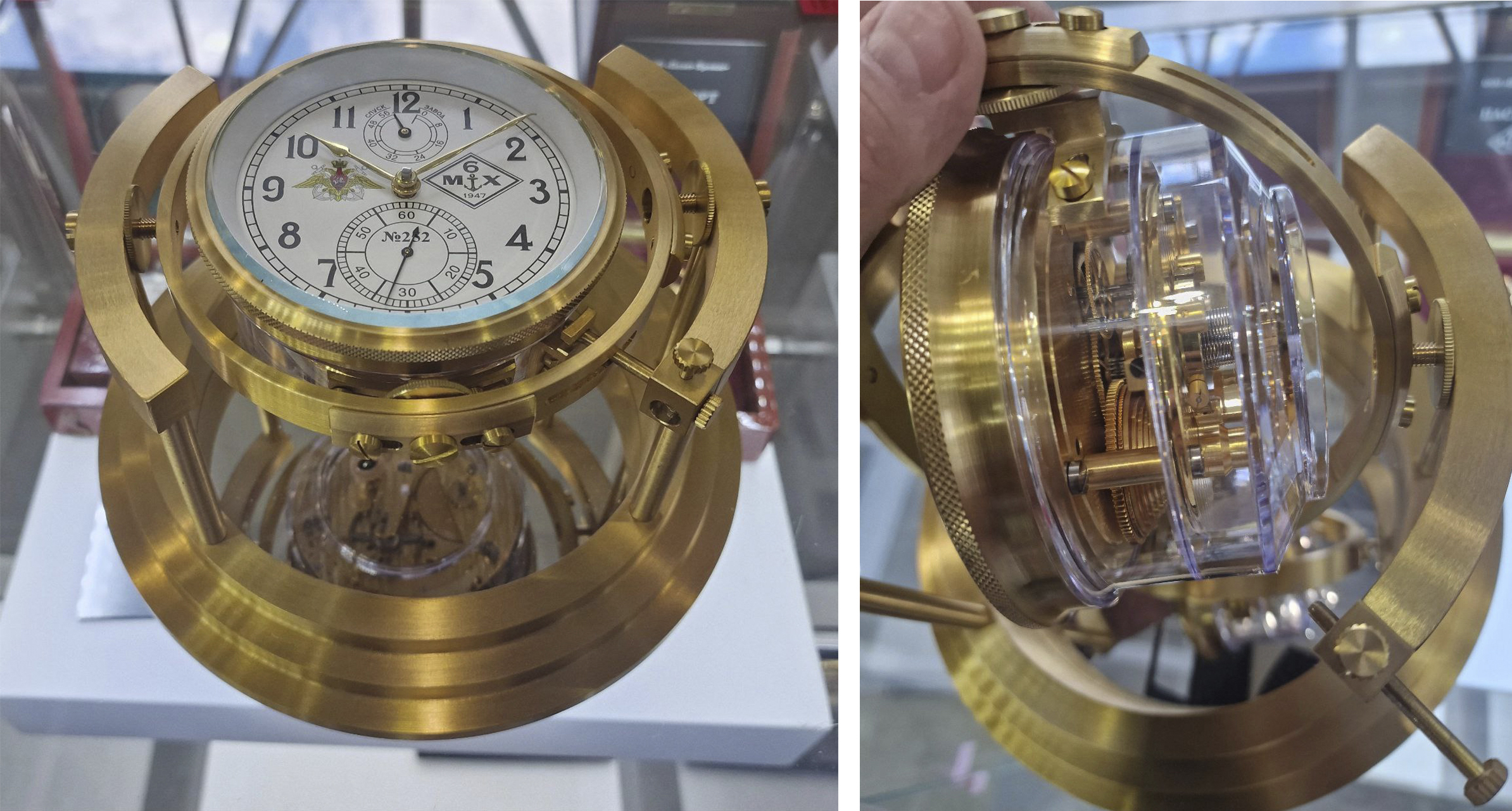В выставочной экспозиции можно увидеть морской хронометр, корпус которого изготовлен из прозрачного полимера, через который можно наблюдать за работой сложного часового механизма.