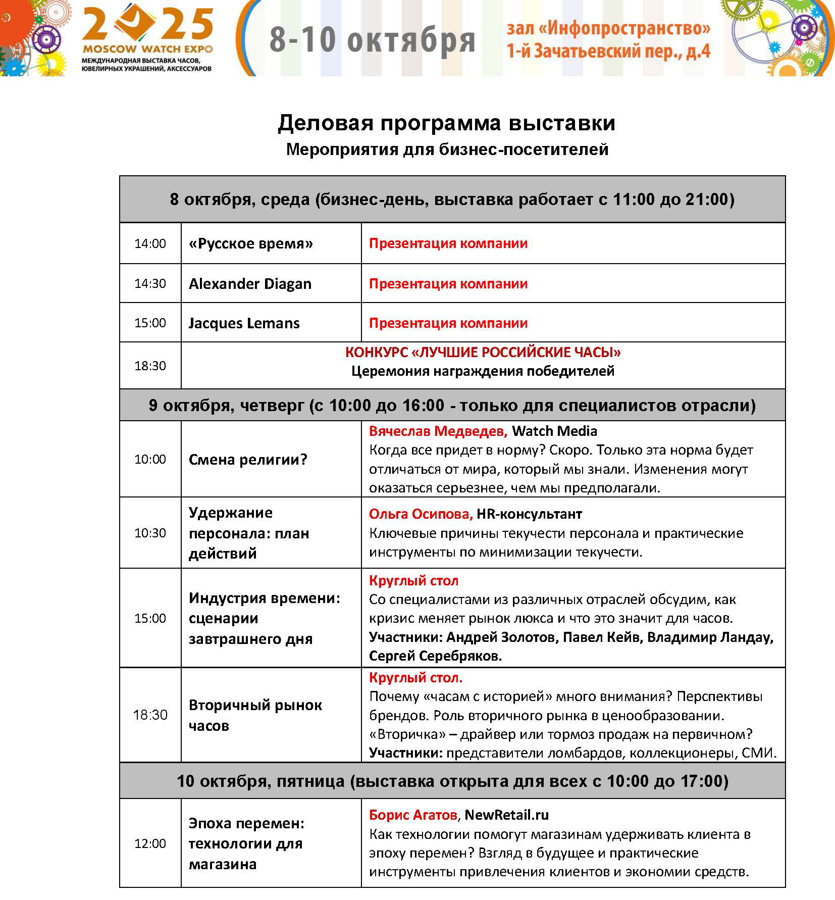 Деловая программа Moscow Watch Expo – это сочетание конференций, докладов, круглых столов для специалистов часового рынка и интересных встреч для любителей часов. Публикуем полное расписание деловой программы MWE-2025. Подробно о каждой сессии можете прочитать на сайте выставки.