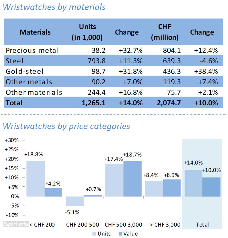 В феврале росли все ценовые группы и категории материалов. Небольшое снижение показали стальные часы, но исключительно за счет снижения их средней стоимости. Чуть просел экспорт часов в диапазоне экспортных цен 200-500 CHF.