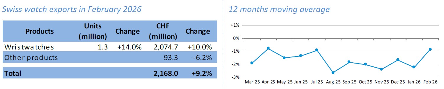 Рост, и рост серьезнейший, - так можно кратко прокомментировать экспорт швейцарских часов в феврале. Целых +10% по часам, и +9.2% по всем связанным с часами товарам – таких цифр отрасль не видела давно.