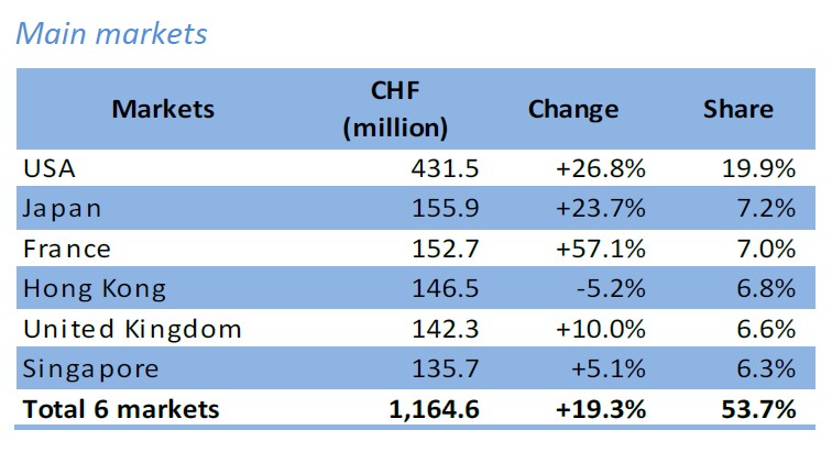 Разумеется, частично это вызвано возобновлением поставок в США – экспорт туда прибавил 27% к прошлогоднему. Но общая цифра выросла бы и без него. На него сработала Япония (+24%), Великобритания (+10%), и прежде всего Франция, которая уже второй месяц отмечается невероятными цифрами. Если в январе рост экспорта туда составил 37%, то в феврале зашкалил за 50%. Я не слышал о взрывном росте спроса на часы во Франции, - снова выскажу предположение, что ряд крупных компаний используют эту страну как логистический хаб. Несколько неожиданными выглядят и цифры роста Японии.