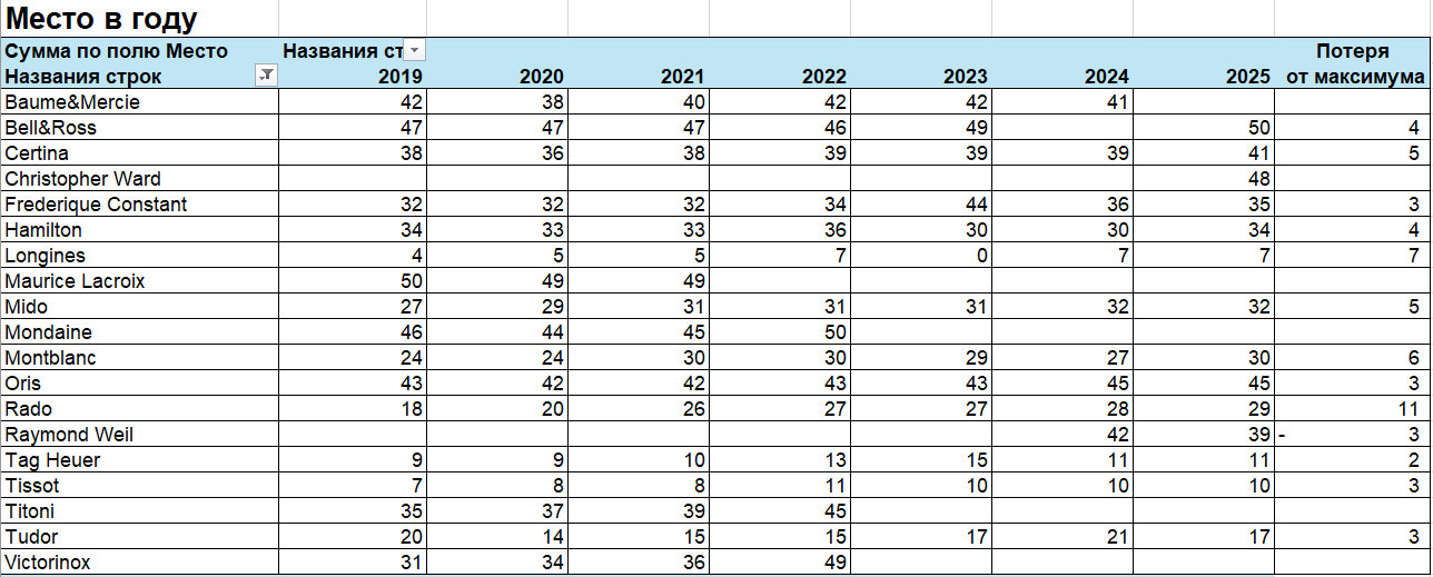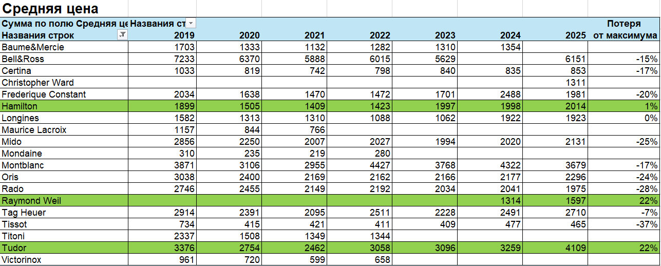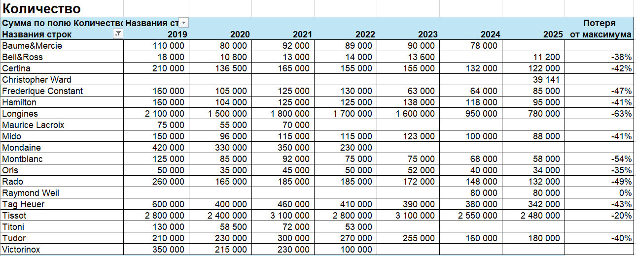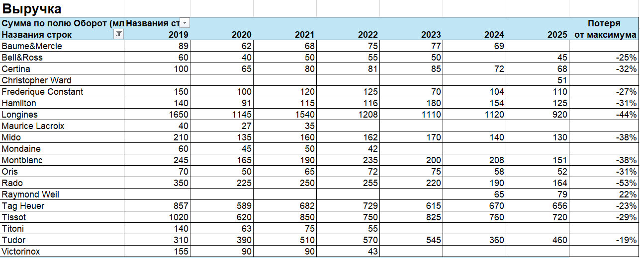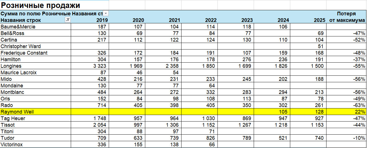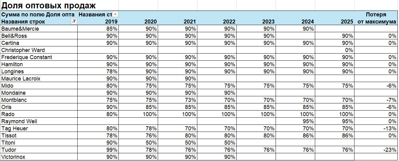 Проанализировали данные отчета Morgan Stanley за 2019-2025 гг. по часовым брендам из доступного ценового сегмента по следующим показателям: место в году, количество, средняя цена, доля оптовых продаж, розничные продажи, выручка. Представляем данные анализа вашему вниманию и приглашаем обсудить в том числе и этот вопрос на первое мероприятие «Среда Медведева», которое состоится 4 марта в 19.00 в Музее Времени и часов в Москве.