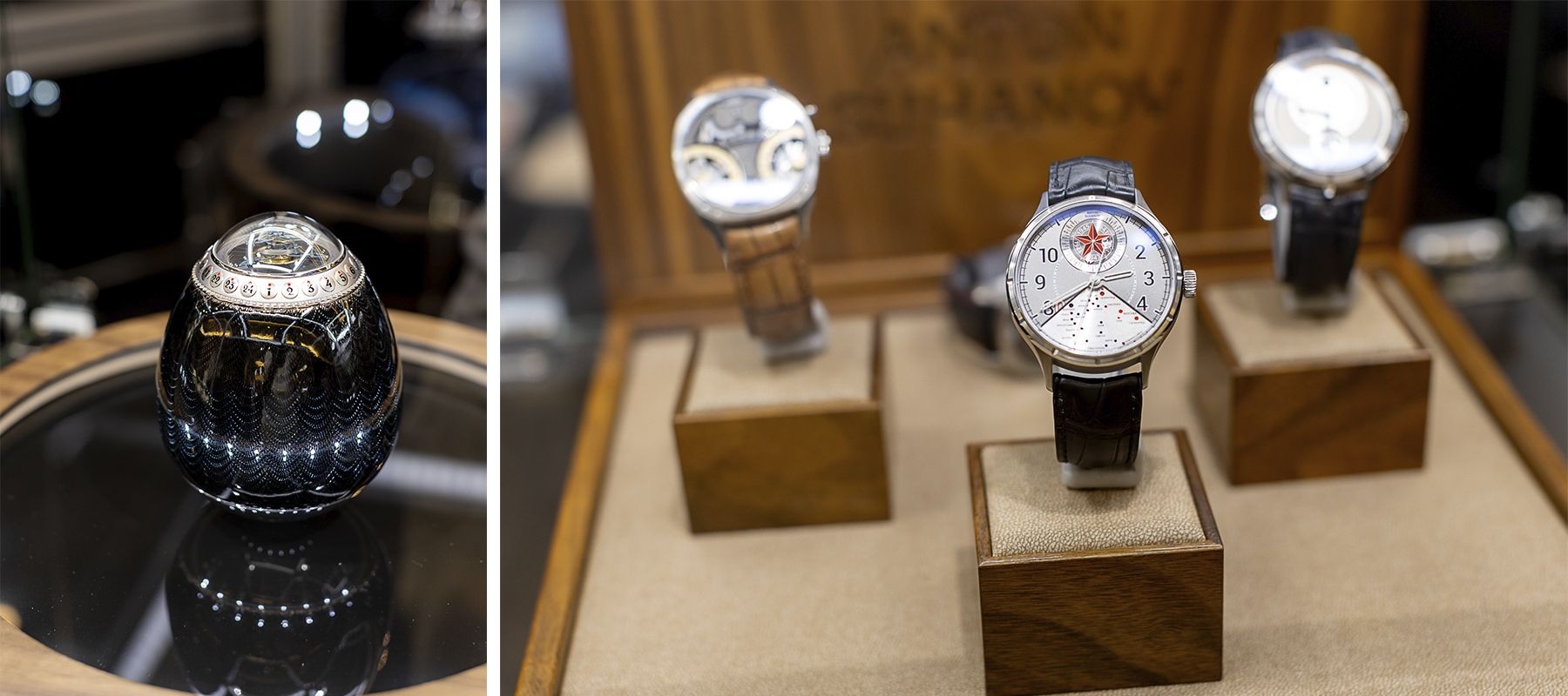 А около входа на выставку, где расположились стенды «Ракеты», Антона Суханова и Константина Чайкина, был полный аншлаг. Суханов показал яйцо-неваляшку с турбийоном, декор и форма которого напоминает об изделиях Фаберже.
