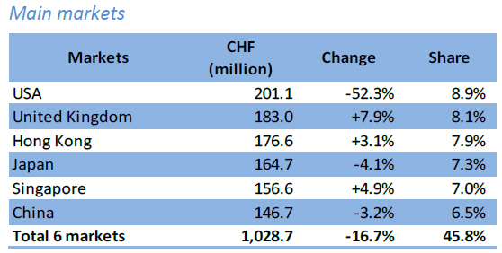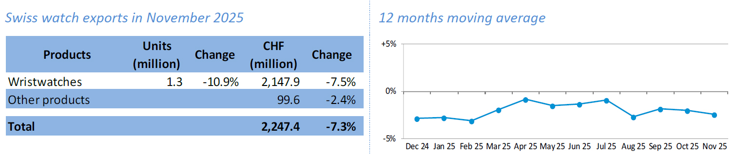 Экспорт часов из Швейцарии в ноябре составил 2,2 млрд франков, что на 7,3% меньше ноября прошлого года. Падение было ожидаемым: перед введением Трампом «штрафных» пошлин на товары из Швейцарии компании постарались ввезти в США максимум товара, после чего поставки туда снизились вдвое.