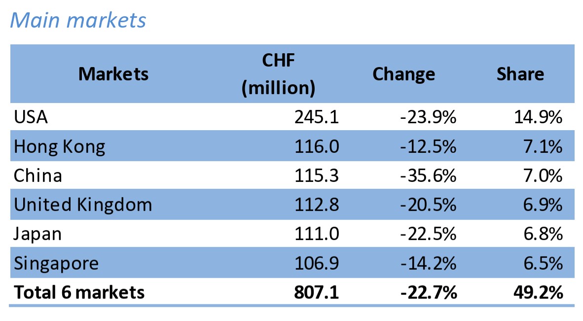 А вот в разрезе типа механизмов ситуация отчасти неожиданная. Кварцевые часы в августе потеряли 19% в количестве и 20% в стоимости, цифры ожидаемые. А механика – 16% в стоимости, но в количестве – всего 10%. То есть вопреки многолетнему тренду, на экспорт пошли чуть более дешевые модели. А возможно, объяснение снова в США: именно Америка потребляла значительную часть экстрадорогих часов, со снижением роли этого рынка картина стала более ровной. Экспорт механизмов в количестве сократился на 20%, в стоимости – всего на 5%. Механика оказалась стабильнее кварца.
