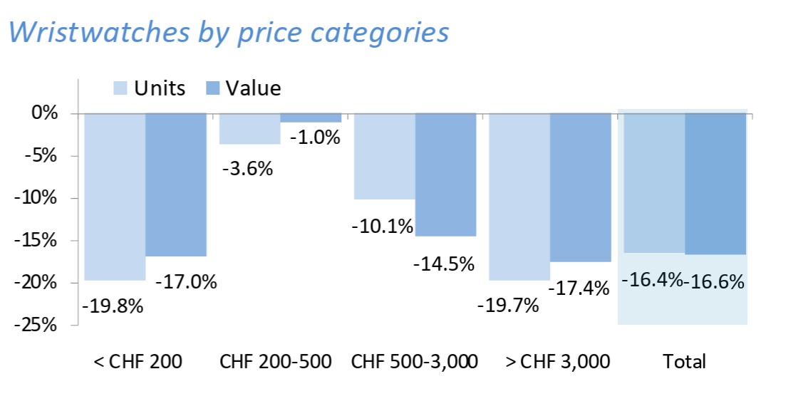 Свой вклад в падение внесли все без исключения ценовые сегменты. В наилучшей форме оказался диапазон 200-500 франков (типичный представитель - Hamilton). В во всех диапазонах падение в количестве оказалось сильнее, чем в стоимости.