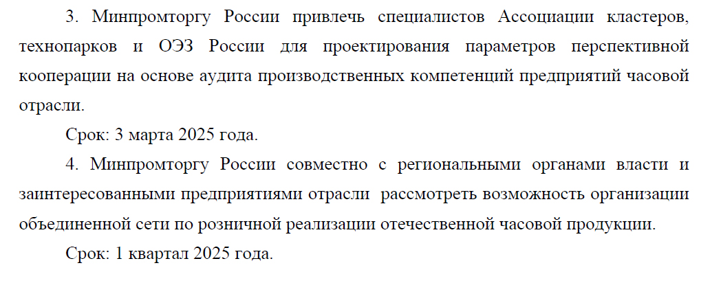 Не вошли в протокол звучавшие вопросы про проблемы с оборудованием и варианты введения запретительных пошлин на импорт, или специального сбора на импортные часы, который бы направлялся на финансирование развития производства внутри России. Хотя некоторые формулировки, касающиеся данных направлений, в тексте найти можно.