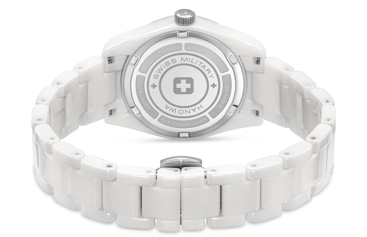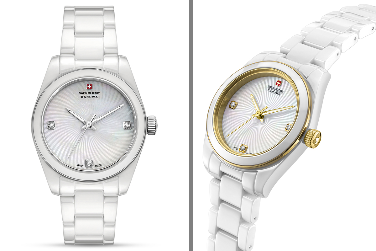 Динамичное настроение модели задает узор в виде расходящегося из центра циферблата вихря. Часы Swiss Military Hanowa Recruit Lady Ceramic представлены в двух версиях: с элементами в оттенках серебра и золота. Эти тона определяют ощущение от новинок и позволят предложить будущей владелице часы, идеально подходящие к ее типу: в холодной или теплой палитре.