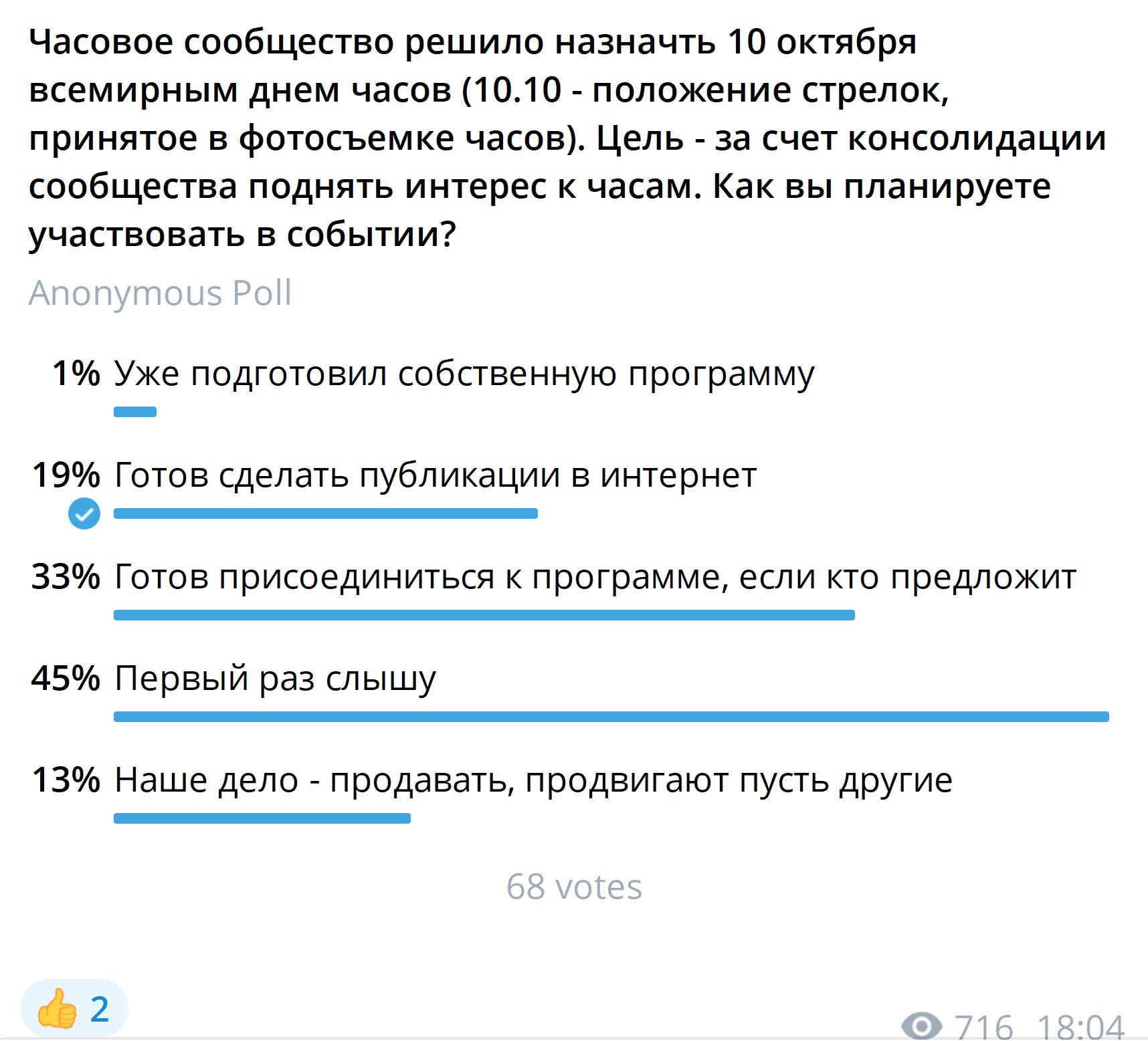 Как любое новое начинание, нельзя сказать, что проект ракетой взмыл в космос. В августе в телеграм-канале Timeseller мы опубликовали опрос о том, кто и как планируют отметить праздник. Из 700 подписчиков в опросе приняли участие всего 68, - скорее всего, остальные о проекте не задумывались.