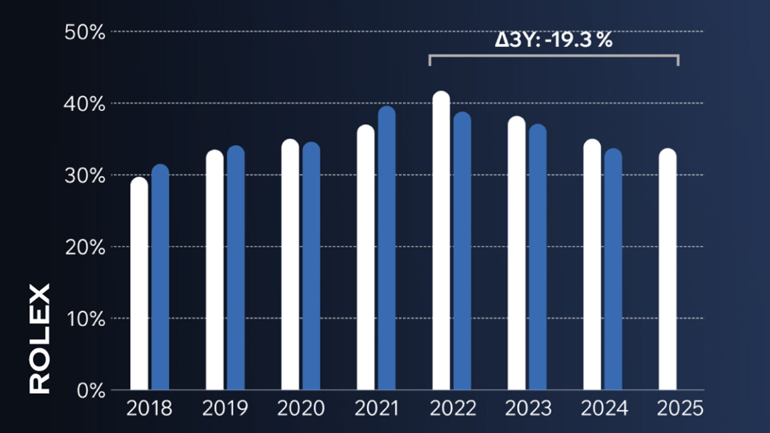 Эти тенденции раскрываются в новом отчёте Chrono24 и Fratello, голландского онлайн-журнала, контрольный пакет акций которого принадлежит платформе вторичного рынка часов класса люкс. За первые шесть месяцев 2022 года на долю Rolex пришлось 42% от общего объёма транзакций на Chrono24, однако в первой половине 2025 года эта доля снизилась до 33%.