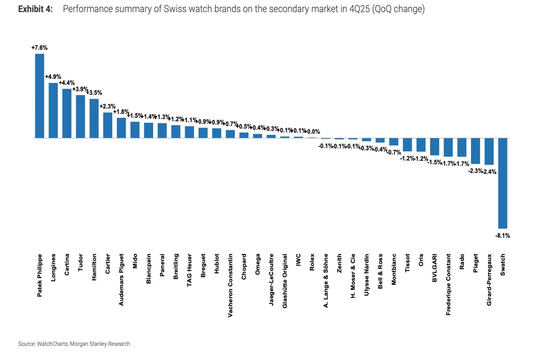 Morgan Stanley в сотрудничестве с Watch Charts представила отчет, посвященный вторичному рынку часов, в котором отслеживаются показатели брендов по сравнению с их первоначальной розничной ценой. В обзоре Morgan Stanley были представлены в общей сложности 35 брендов, в первую очередь бренды Richemont, Swatch Group и LVMH, а также крупные независимые игроки, такие как Rolex, Patek Philippe и Audemars Piguet. В конце года цены на б/у часы выросли на 1,9% по сравнению с предыдущим кварталом, причем рост показали 21 из 35 отслеживаемых брендов. Тем не менее, основными драйверами рынка оставались Rolex, Patek Philippe и Audemars Piguet.Они показывали на вторичном рынке более высокую стоимость по сравнению с первоначальной ценой (что отличает их от большинства, теряющего в цене после выхода из часового салона).