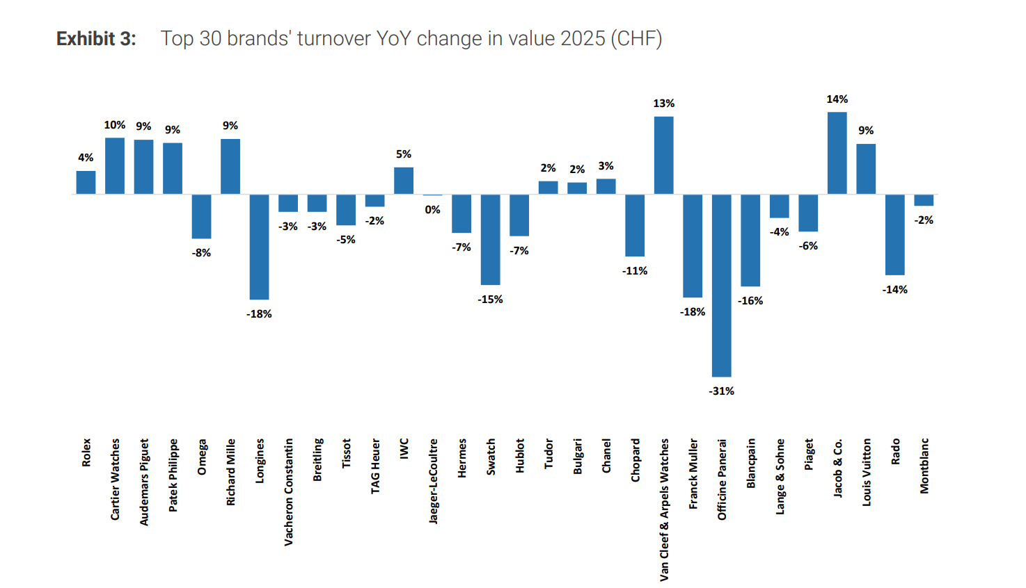 По данным отчета Morgan Stanley и LuxeConsult, компания Jacob & Co. возглавила рейтинг самых динамично развивающихся швейцарских часовых марок по итогам 2025 года. Компания продемонстрировала лучшие результаты среди 50 ведущих брендов как по объему выручки, так и по количеству проданных единиц. Выручка часового подразделения достигла 180 миллионов долларов США, показав рост на 14% в годовом исчислении — это самый высокий показатель во всей отрасли. Объем продаж вырос до 3 975 экземпляров, увеличившись на 24%, что также стало рекордным показателем роста в рейтинге Top 50. Благодаря такой динамике Jacob & Co. поднялся на 27-ю строчку в общем рейтинге швейцарских часовых брендов по обороту.