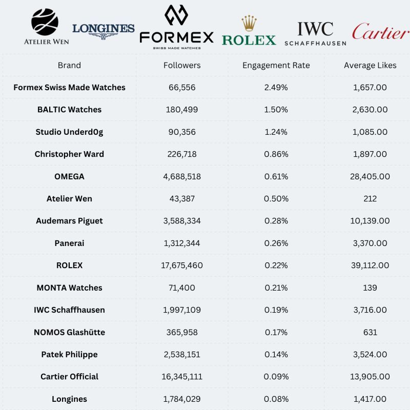 Эксперт Химаниш Чандра проанализировал количество лайков и степень вовлеченности пользователей в соцсетях 15 часовых компаний и пришел к выводу, что микробренды и независимые марки часов формируют сообщества, которые активнее вовлекаются. В то время, как подписчиков у таких марок, как Atelier Wen и Baltic Watches гораздо меньше, чем у крупных домов, их аудитория увлечена предлагаемой информацией. Formex, например, имеет уровень вовлечённости 2,49%. Baltic — 1,50%, в то время, как у Rolex показатель составляет всего 0,22%, а у Cartier с 0,09%.