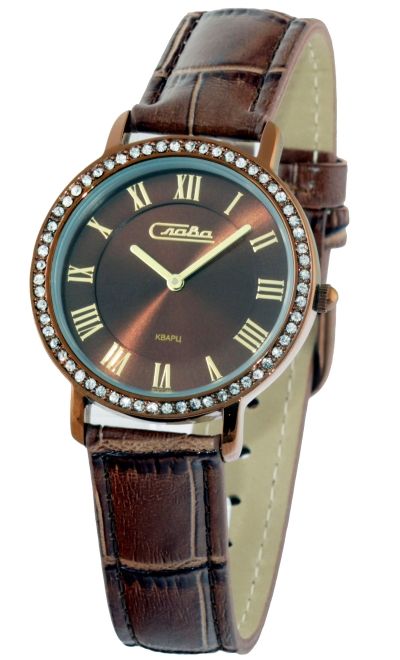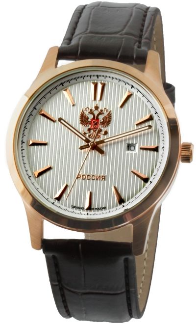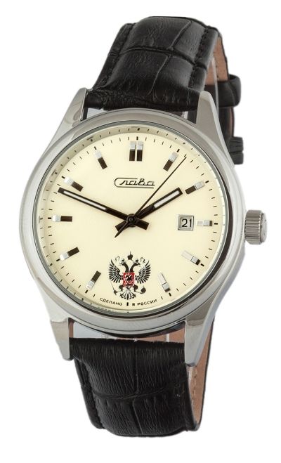 Механические часы с механизмом «Слава» 2414, с календарем, с противоударным устройством узла баланса; Водозащита (WR) 30м; Минеральное стекло; Кожаный ремешок; Корпус изготовлен из часовой латуни с декоративным покрытием; Запас хода до 38 часов; Диаметр 40 мм.