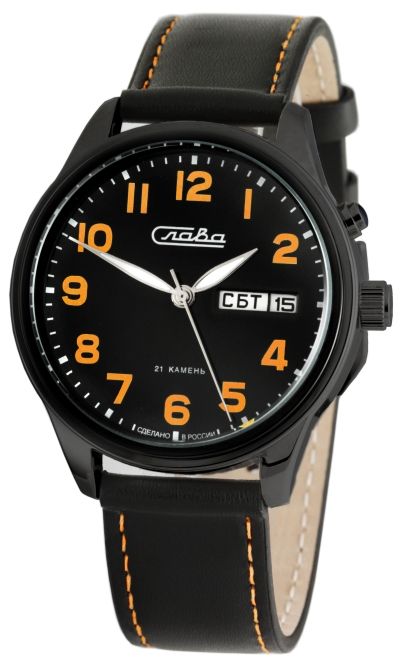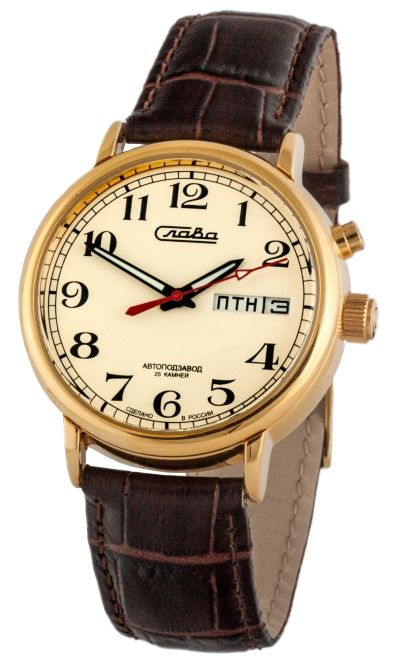 Механические часы с механизмом «Слава» 2427, с автоподзаводом, с двойным календарем, с противоударным устройством узла баланса; Водозащита (WR) 30м; Минеральное, выпуклое стекло; Кожаный ремешок; Корпус изготовлен из часовой латуни с декоративным покрытием; Запас хода до 31 часов; Диаметр 40 мм.