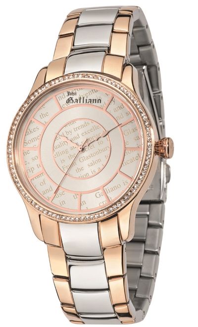 Женские кварцевые часы из коллекции Metropolis на полированном биколорном браслете из стали с PVD-покрытием. Корпус диаметром 38 мм, минеральное стекло, серебристый циферблат украшен фирменным "газетным" принтом Galliano, безель декорирован стразами. Водоустойчивость 30м.