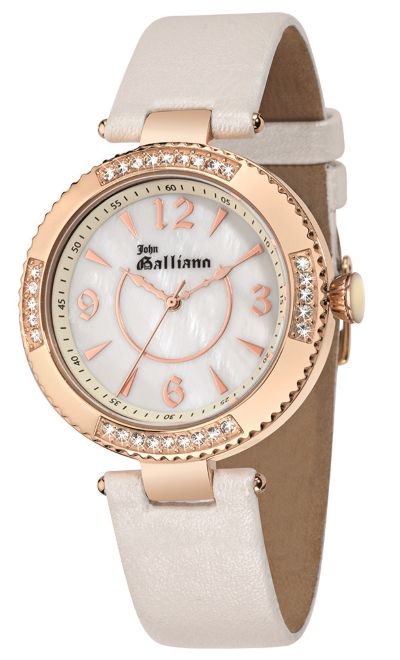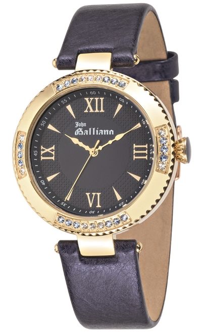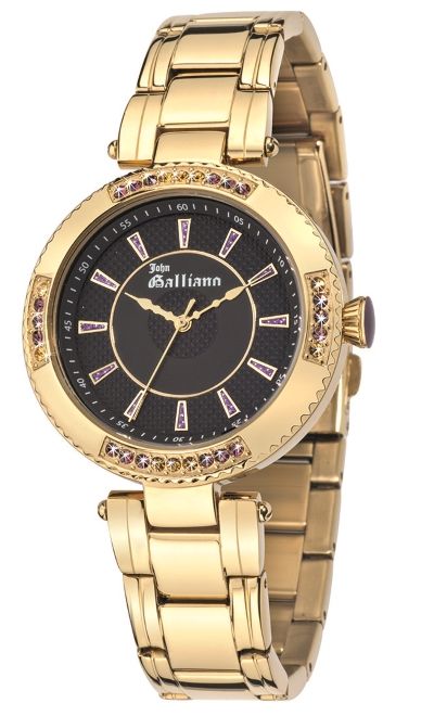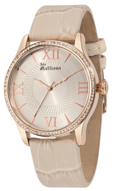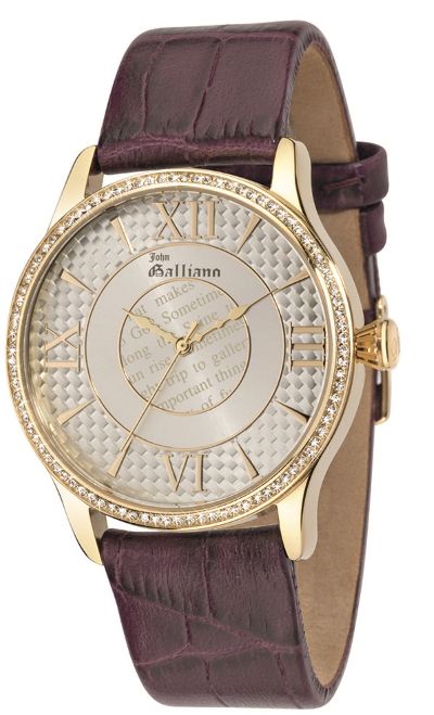Женские кварцевые часы из коллекции Metropolis с PVD-покрытием оттенка "желтое золото". Корпус диаметром 38 мм, минеральное стекло, серебристый циферблат со сложным декором- украшен фирменным "газетным" принтом Galliano в центре и необычным гильоше. Римские цифры, безель декорирован стразами. Водоустойчивость 30м.