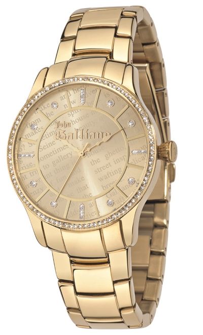 Женские кварцевые часы из коллекции Metropolis на полированном стальном браслете c PVD-покрытием оттенка "желтое золото". Корпус диаметром 38 мм, минеральное стекло, золотистый циферблат украшен фирменным "газетным" принтом Galliano тон-в-тон, индексы и безель декорированы стразами. Водоустойчивость 30м.