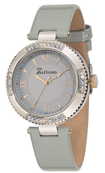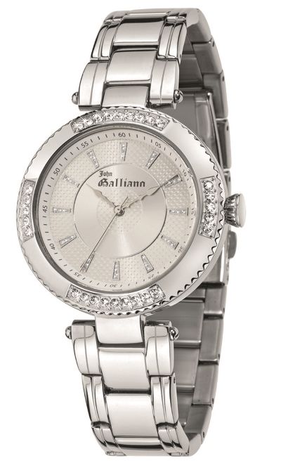 Женские кварцевые часы из коллекции Metropolis на полированном стальном браслете. Корпус диаметром 38 мм, минеральное стекло, нежно-голубой лучистый циферблат украшен фирменным "газетным" принтом Galliano, безель декорирован стразами. Водоустойчивость 30м.