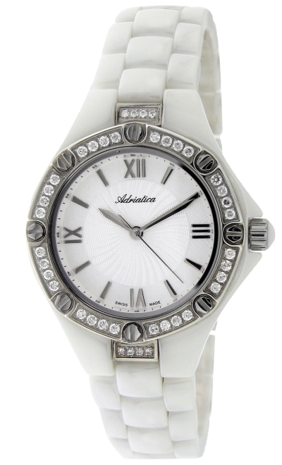 Корпус и браслет: белая или черная керамика. Инкрустация цирконами по безелю.