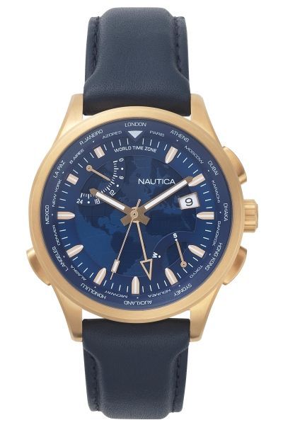 Циферблат с монохромным изображением карты мира, окно даты в зоне 2-х часов, отображение мирового времени и сезона