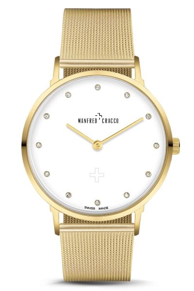 Механизм: Ronda 762SW. Корпус и браслет: нержавеющая сталь 316L, IP покрытие золотистого цвета, сапфировое стекло, размер циферблата 40 мм, цвет циферблата белый матовый. Кристаллы Swarovski. Водозащита: 3 ATM