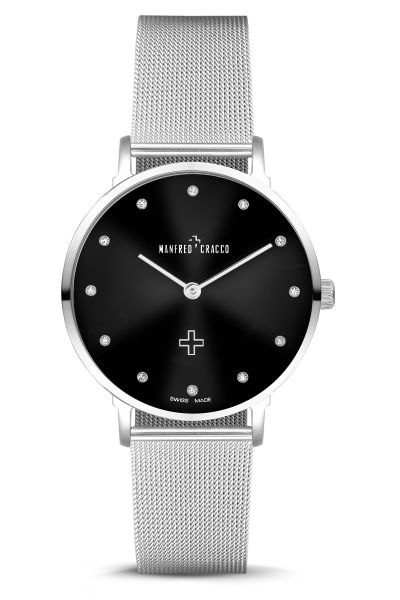Кварцевый механизм: Ronda 762SW. Корпус и браслет: нержавеющая сталь 316L, сапфировое стекло, размер циферблата 34 мм, цвет циферблата черный матовый. Кристаллы Swarovski. Водозащита: 3 ATM