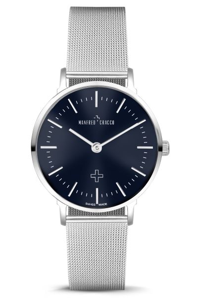 Кварцевый механизм: Ronda 762SW. Корпус и меш-браслет: нержавеющая сталь 316L, сапфировое стекло, размер циферблата 34 мм. Цвет циферблата синий. Водозащита: 3 ATM