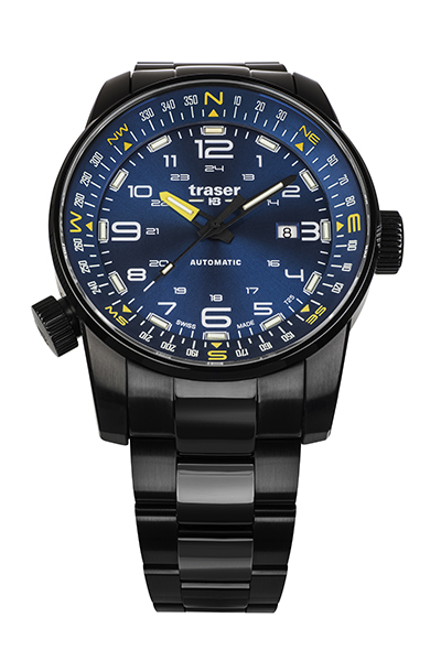 Циферблат: синий, 12 и 24 часовая шкала, вращающееся кольцо компаса,