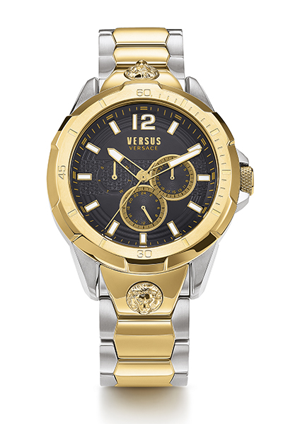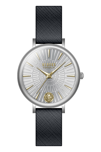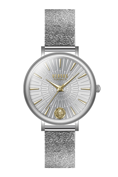 Циферблат украшен гламурной текстурой в виде литеры «V» (Versus), а знаковое лого в зоне «6:00» подчеркивает связь с брендом.