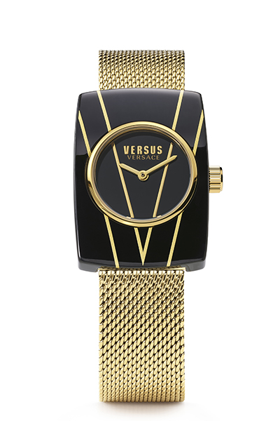 Прямоугольный корпус из смолы заключает в себе небольшой циферблат, украшенный логотипом Versus Versace.