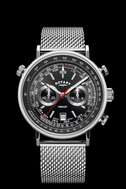 Эффектный черный циферблат оснащен двумя дополнительными циферблатами и окошком даты в положении 6 часов