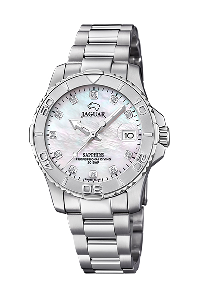 Циферблат из натурального перламутра, индексы из кристаллов циркона, крупная лупа над датой