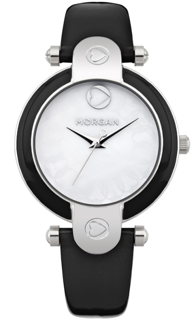 Стильный минимализм в фирменных цветах бренда: кожаные ремни красного, черного и белого цветов вторят покрытию из эмали на внешнем ранте. Циферблат из натурального перламутра декорирован паттерном из сердечек, символизирующих любовь бренда MORGAN к своим поклонницам.