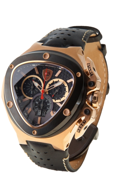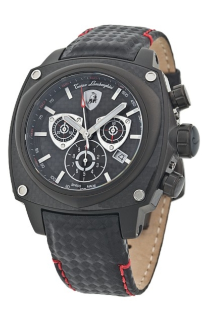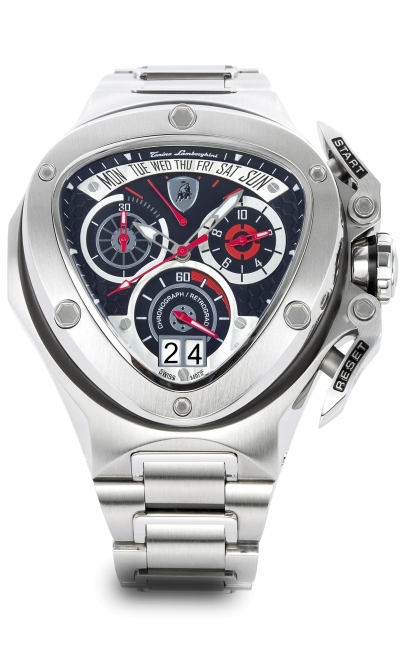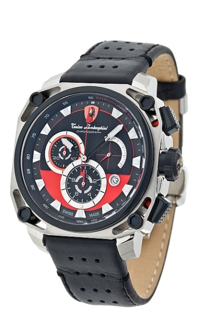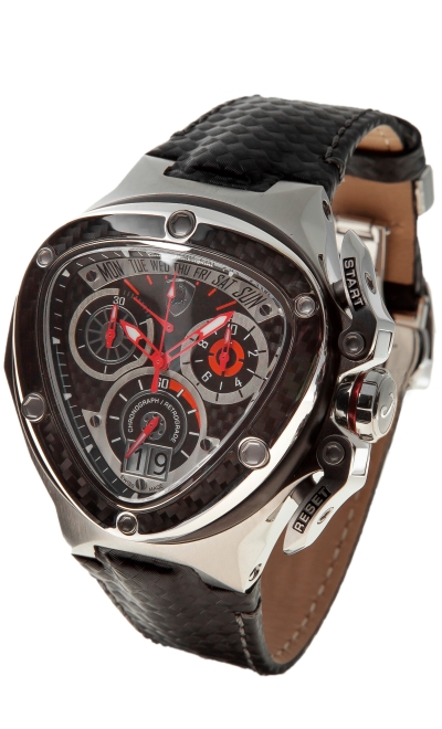 Корпус: Нержавеющая сталь черного цвета. Безель выполнен из полированной нержавеющей стали в виде фирменного щита. Кнопки и заводная головка - нержавеющая сталь зеркальной полировки. Циферблат черного цвета. Дополнительные циферблаты хронографа белого цвета, также выполнены в виде фирменных щитов, с карбоновым тиснением. 10 больших люминесцентных индекса. Фирменный логотип - щит Tonino Lamborghini размещен на отметке 12 часов. Стрелки: нержавеющая сталь зеркальной полировки.