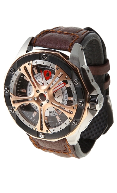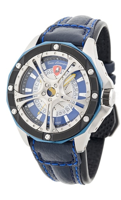 Корпус: нержавеющая сталь зеркальной полировки (серебряного, синего, черного цвета). Безель состоит из 2-х компонентов: уникальный дизайн внешней части циферблата, выполненного в виде колесного диска Lamborghini из нержавеющей стали зеркальной полировки. Декоративные винты из нержавеющей стали украшают безель. Циферблат синего цвета с черной окантовкой. 11 индексов с люминесцентным покрытием. Лого Tonino Lamborghini на отметке 12 часов. Окошко даты - на отметке 4 1/2H. Стрелки из нержавеющей стали.
