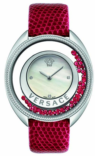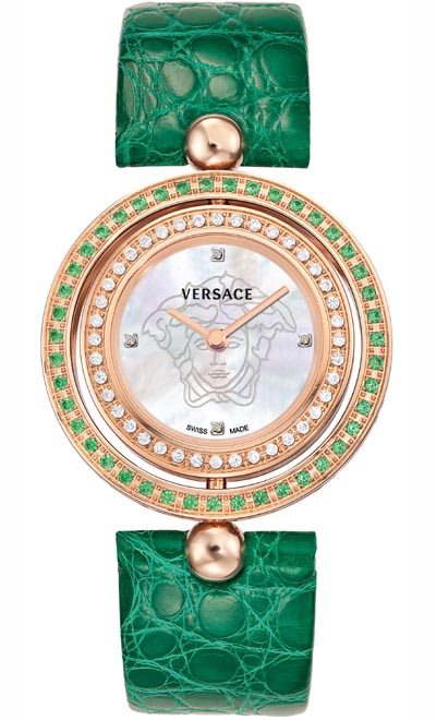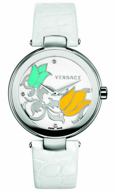 Циферблат: белая эмаль, 3 бриллианта на отметках времени (ct. 0,023), декорация в стиле барокко, тюльпаны, логотип Versace