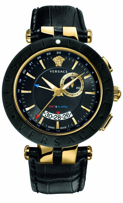 Корпус:46 мм, полированная сталь, IPYG-покрытие, черный полиуретановый безель с гравировкой логотипа Versace, индивидуальный номер на задней крышке Циферблат: черный со стальными рисками времени с YG-покрытием и фирменным знаком Versace на отметке "12 часов", голубая стрелка - будильник, красная - GMT