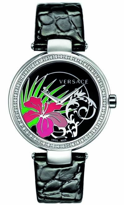 Циферблат: декорация в стиле барокко, фиолетовый цветок гибискус, логотип Versace