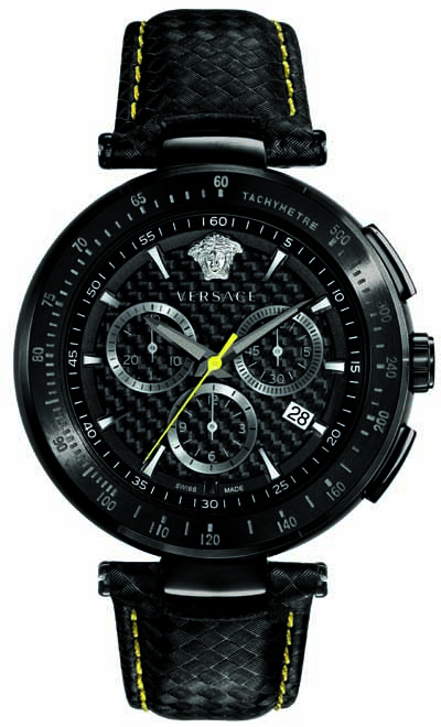 Циферблат: черный, текстурная обработка под карбон, желтая секундная стрелка, фирменный знак Versace (голова Медузы) на отметке "12 часов"