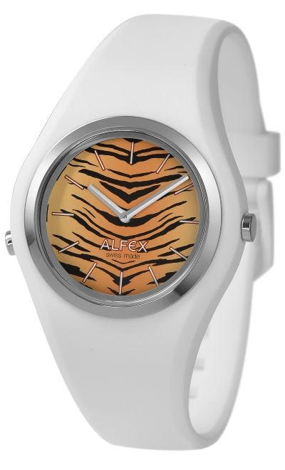 Модель из коллекции IKON, кварцевый механизм, корпус (42,5 мм) и ремень анти-аллергенный силикон (белый), безель и задняя крышка блестящая сталь 316L, подсветка циферблата белая, циферблат - принт тигр , индексы белые