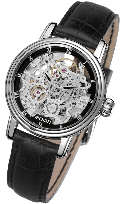 Особенности: прозрачная задняя смотровая крышка, скелетонизированный циферблат, заводная головка в форме луковицы, синие вороненые винты