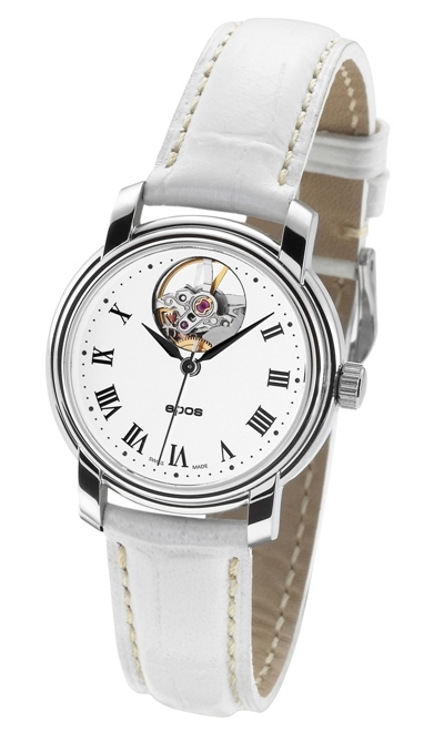 Особенности: прозрачная задняя смотровая крышка, открытый баланс, перламутровый циферблат, синие вороненые винты