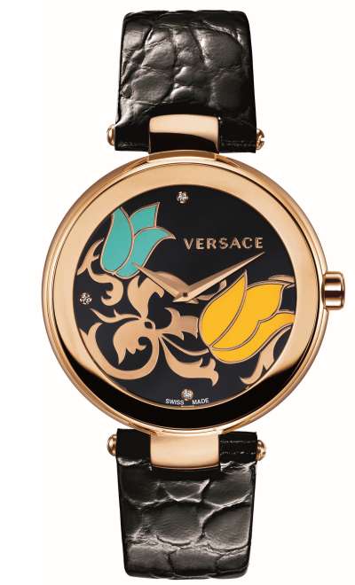 Циферблат: черная эмаль, 3 бриллианта на отметках времени (ct. 0,023), декорация в стиле барокко, тюльпаны, логотип Versace