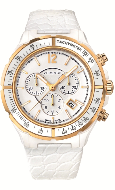Корпус:46 мм, полированная сталь, IPYG-покрытие, белый полиуретановый безель с гравировкой логотипа Versace, индивидуальный номер на задней крышке