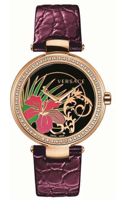 Циферблат:декорация в стиле барокко, фиолетовый цветок гибискус, логотип Versace