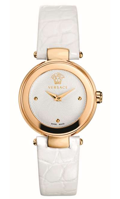 Циферблат: белый перламутр с фирменным знаком Versace на отметке "12 часов", 3 бриллианта на индексах (ct. 0,015)