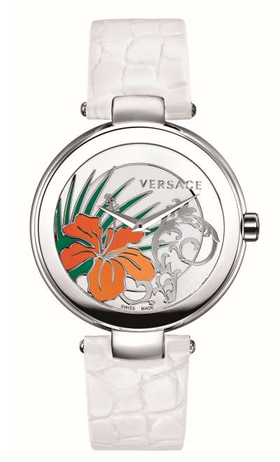 Циферблат: белый, декорация в стиле барокко, оранжевый цветок гибискус, логотип Versace