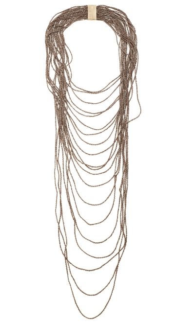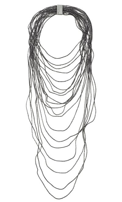 Колье из коллекции DNA, это результат особой технологии, которая позволяет соединить вместе цепочки из серебра 925 пробы и тончайшую нейлоновую нить в спиралевидную форму, способную растягиваться.